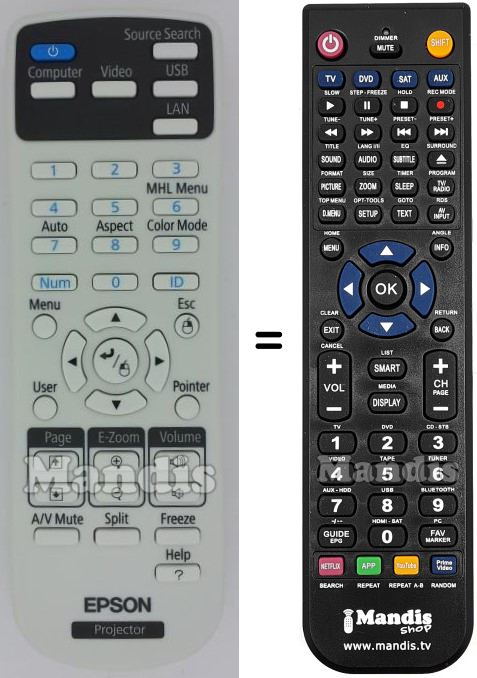 This remote control performs all the functions of the original remote control: Power, Source Search, Computer, Video, USB, LAN, 1, 2, 3, 4, 5, MHL Menu, Auto, Aspect, 6, Color Mode, 7, 8, 9, 0, Menu, Esc, User, Pointer, Up, Down, Right, Left, Enter, A/V Mute, Split, Freeze, ?/Help, Page Up, Page Down, E-Zoom+, E-Zoom-, Vol+, Vol-, ID