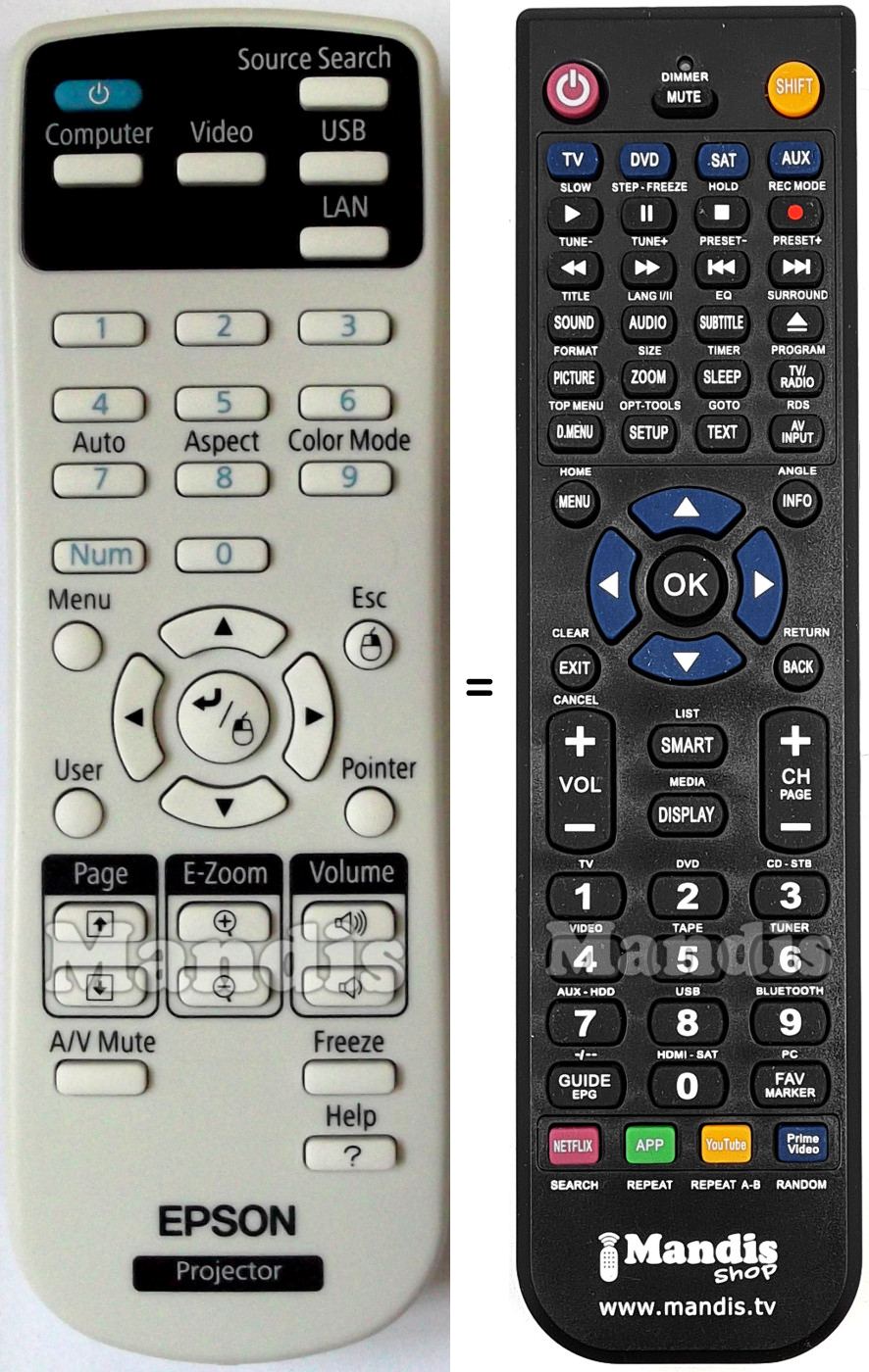 This remote control performs all the functions of the original remote control: Power, Source Search, Computer, Video, USB, LAN, 1, 2, 3, 4, 5, 6, 7 / Auto, 8 / Aspect, 9 / Color Mode, 0, Num, Menu, Esc / Right Click, Up, Down, Right, Left, Enter / Left Click, User, Pointer, Page Up, Page Down, E-Zoom +, E-Zoom -, Volume +, Volume -, A / V Mute, Freeze, Help