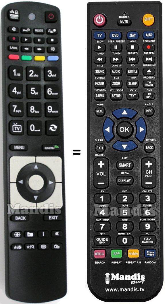 Below, we will show you the correspondence between each button on the original remote control and the button that performs the same function on the replacement remote control. In some cases, you may need to press the SHIFT key before pressing another button to perform certain actions. These additional functions are often not widely used and are included to facilitate understanding of the replacement remote control, or because the original remote control has more buttons than its equivalent.