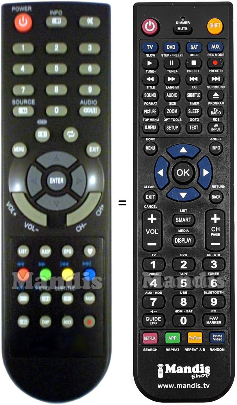 Below, we will show you the correspondence between each button on the original remote control and the button that performs the same function on the replacement remote control. In some cases, you may need to press the SHIFT key before pressing another button to perform certain actions. These additional functions are often not widely used and are included to facilitate understanding of the replacement remote control, or because the original remote control has more buttons than its equivalent.