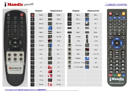Below, we will show you the correspondence between each button on the original remote control and the button that performs the same function on the replacement remote control. In some cases, you may need to press the SHIFT key before pressing another button to perform certain actions. These additional functions are often not widely used and are included to facilitate understanding of the replacement remote control, or because the original remote control has more buttons than its equivalent.