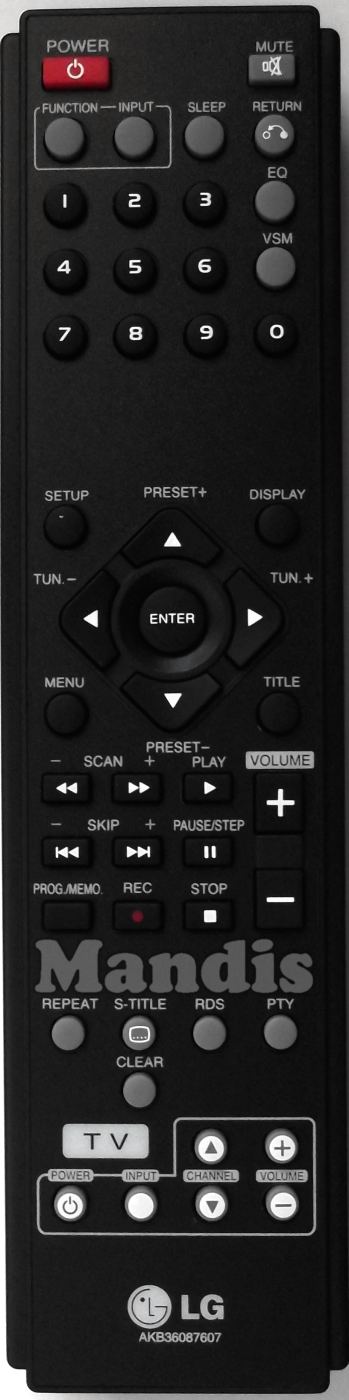 Power, Mute, Function, Input, Sleep, Return, EQ, VSM, 1, 2, 3, 4, 5, 6, 7, 8, 9, 0, Setup, Display, Up / Preset +, Down / Preset -, Right / Tun +, Left / Tun -, Enter, Menu, Title, << / Scan -, >> / Scan +, Play, Volume +, Volume -, I<< / Skip -, >>I / Skip +, Pause / Step, Prog. Memo., Rec, Stop, Repeat, S-Title, RDS, PTY, Clear, TV Power, TV Input, TV Channel +, TV Channel -, TV Volume +, TV Volume -