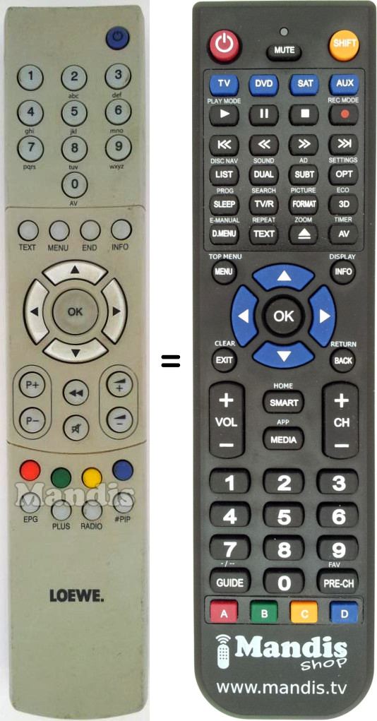 Below, we will show you the correspondence between each button on the original remote control and the button that performs the same function on the replacement remote control. In some cases, you may need to press the SHIFT key before pressing another button to perform certain actions. These additional functions are often not widely used and are included to facilitate understanding of the replacement remote control, or because the original remote control has more buttons than its equivalent.
