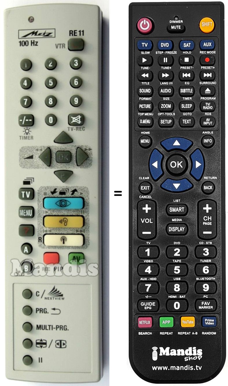 Remote control to replace the original RE 11 (600RE1167KD) and all its functions.