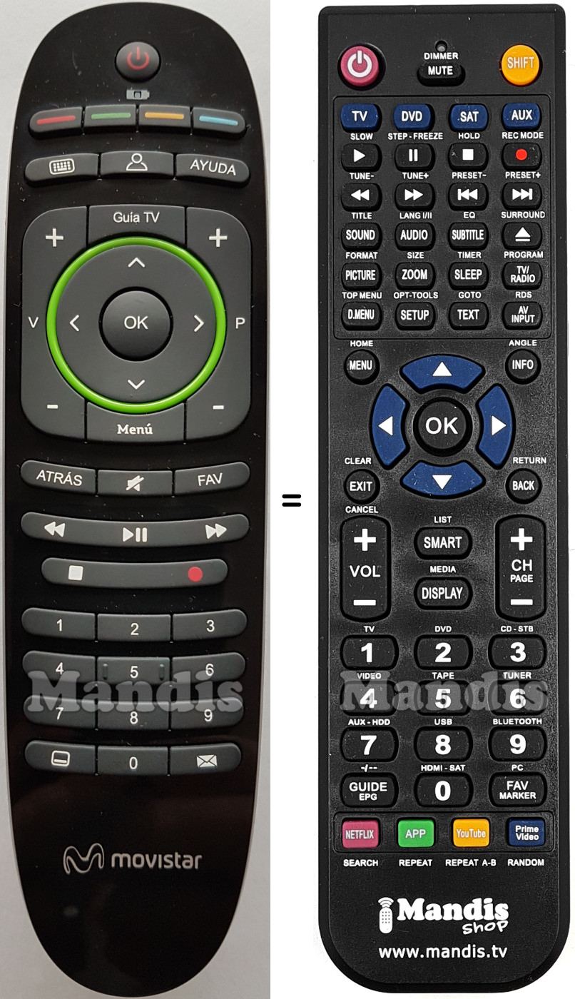 Below, we will show you the correspondence between each button on the original remote control and the button that performs the same function on the replacement remote control. In some cases, you may need to press the SHIFT key before pressing another button to perform certain actions. These additional functions are often not widely used and are included to facilitate understanding of the replacement remote control, or because the original remote control has more buttons than its equivalent.