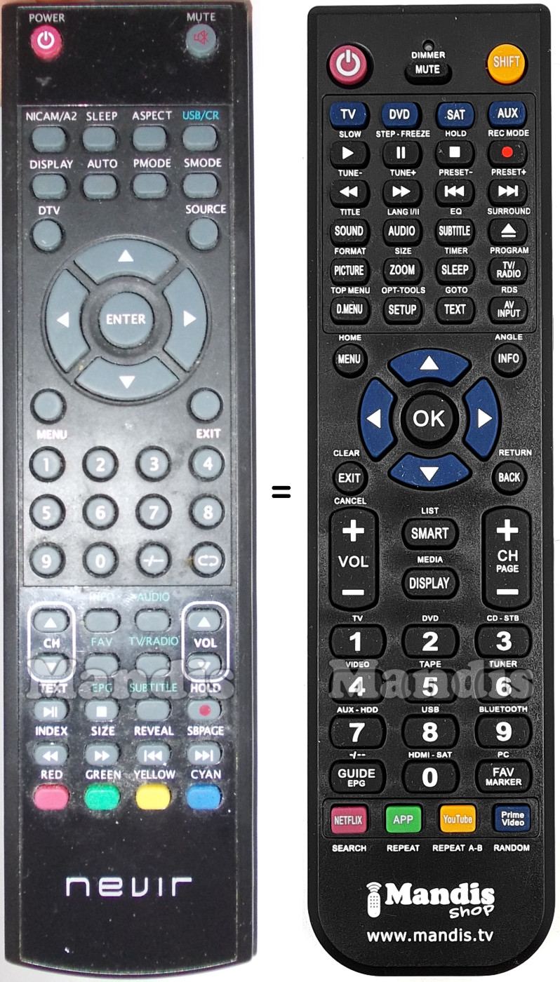 Below, we will show you the correspondence between each button on the original remote control and the button that performs the same function on the replacement remote control. In some cases, you may need to press the SHIFT key before pressing another button to perform certain actions. These additional functions are often not widely used and are included to facilitate understanding of the replacement remote control, or because the original remote control has more buttons than its equivalent.