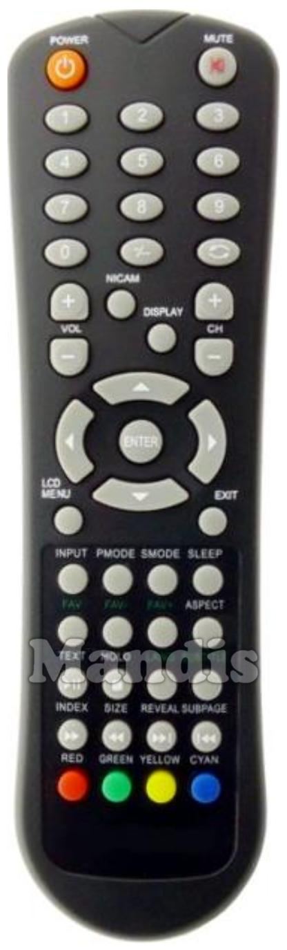 Power, Mute, 1, 2, 3, 4, 5, 6, 7, 8, 9, 0, -/--, Recall, Vol +, Vol -, Nicam, Display, CH +, CH -, Up, Left, Enter, Right, Down, LCD Menu, Exit, Input, PMode, SMode, Sleep, Fav, Fav -, Fav +, Aspect, Play/Pause / Text, Stop / Hold, Lang, Subtitle, >> / Index, << / Size, >>I / Reveal, I<< / Subpage, Red, Green, Yellow, Cyan