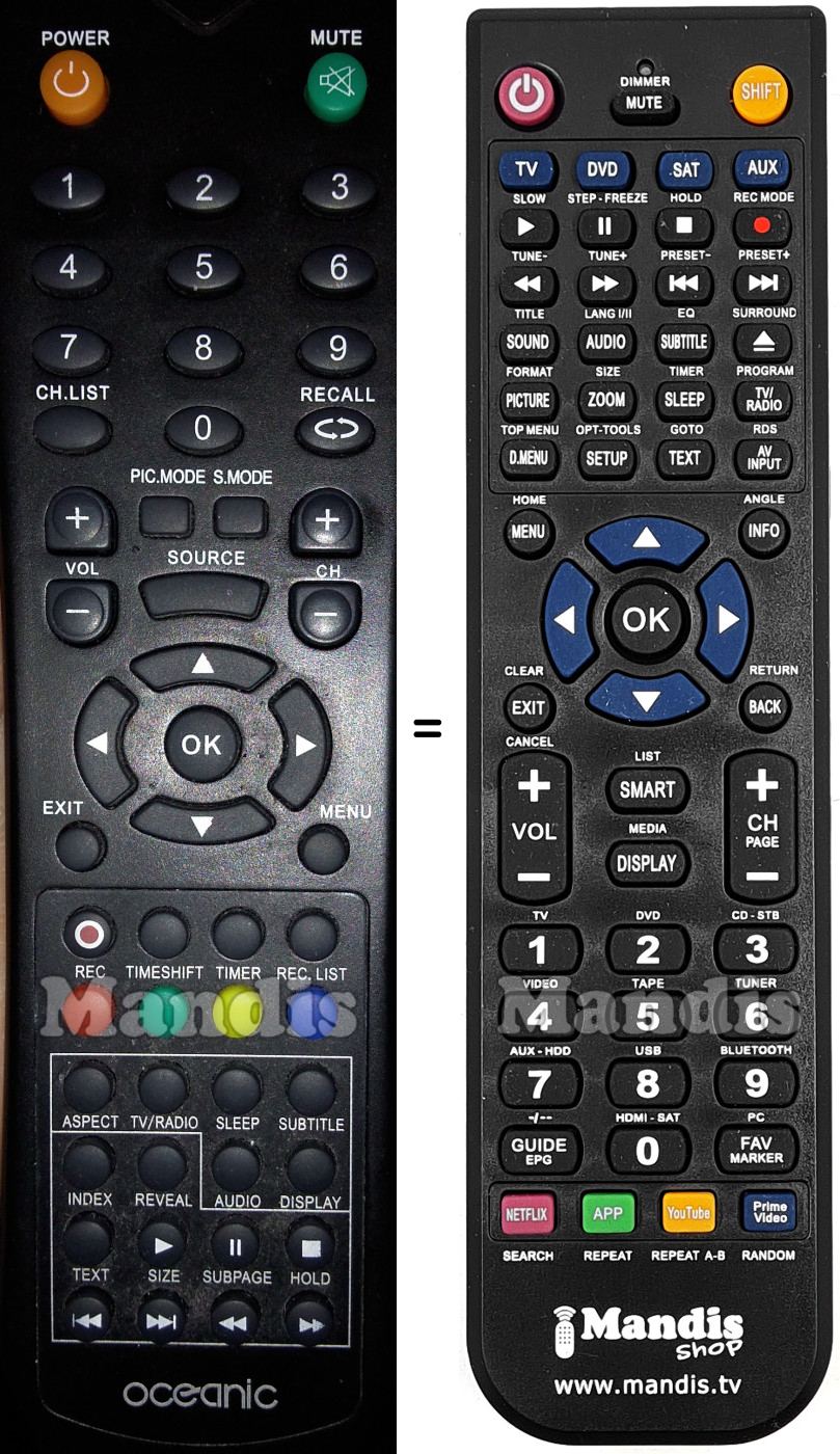 Below, we will show you the correspondence between each button on the original remote control and the button that performs the same function on the replacement remote control. In some cases, you may need to press the SHIFT key before pressing another button to perform certain actions. These additional functions are often not widely used and are included to facilitate understanding of the replacement remote control, or because the original remote control has more buttons than its equivalent.