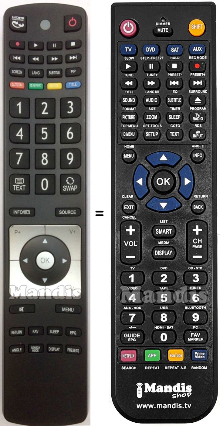 Below, we will show you the correspondence between each button on the original remote control and the button that performs the same function on the replacement remote control. In some cases, you may need to press the SHIFT key before pressing another button to perform certain actions. These additional functions are often not widely used and are included to facilitate understanding of the replacement remote control, or because the original remote control has more buttons than its equivalent.