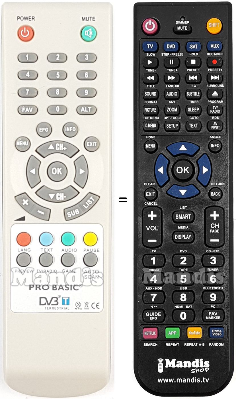 Below, we will show you the correspondence between each button on the original remote control and the button that performs the same function on the replacement remote control. In some cases, you may need to press the SHIFT key before pressing another button to perform certain actions. These additional functions are often not widely used and are included to facilitate understanding of the replacement remote control, or because the original remote control has more buttons than its equivalent.