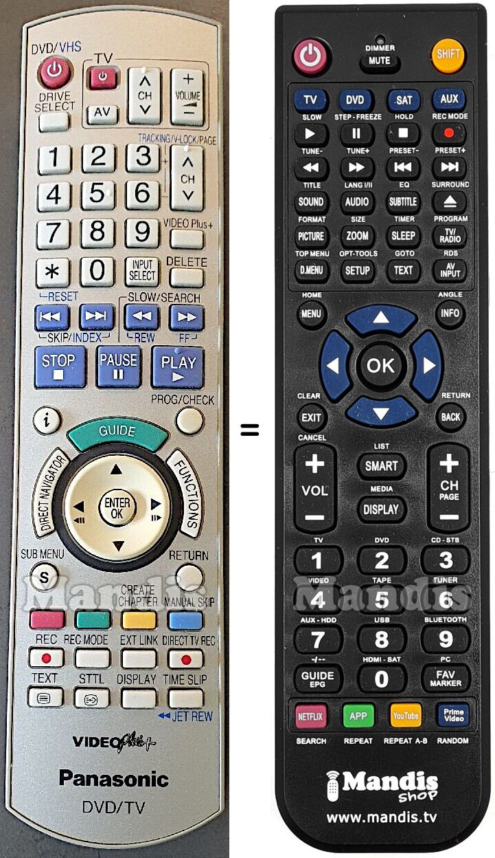 This remote control performs all the functions of the original remote control: DVD/VHS Power, TV Power, TV AV, TV CH+, TV CH-, TV Volume+, TV Volume-, Drive Select, 1, 2, 3, 4, 5, 6, 7, 8, 9, 0, * / Reset, Input Select, CH + Tracking/V-Lock +, CH - Tracking/V-Lock -, VIDEO Plus+, Delete, I<< Skip/Index, >>I Skip/Index, << REW, >> FF, Stop, Pause, Play, i, Prog/Check, Guide, Direct Navigator, Functions, Up, Left / <II, Enter / OK, Down, Right 7 II>, Sub Menu, Return, Red, Green, Yellow / Create Chapter, Blue / Manual Skip, Rec, Rec Mode, Ext Link, Direct TV Rec, Text, STTL, Display, Time Slip / << Jet Rew
