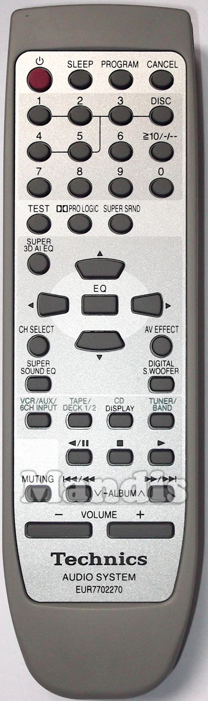 Power, Sleep, Program, Cancel, 1, 2, 3, 4, 5, 6, 7, 8, 9, 0, >=10 / -/--, Disc, Test, DD Pro Logic, Super SRND, Super 3D AI EQ, Up, Left, EQ, Right, Down, CH Select, AV Effect, Super Sound EQ, Digital S.Woofer, VCR / AUX / 6CH INPUT, TAPE / Deck 1/2, CD / Display, TUNER/BAND, Pause / Rev. Play, Stop, Play, I<< / << / Album-, >> / >>I / Album+, Muting, Volume-, Volume+