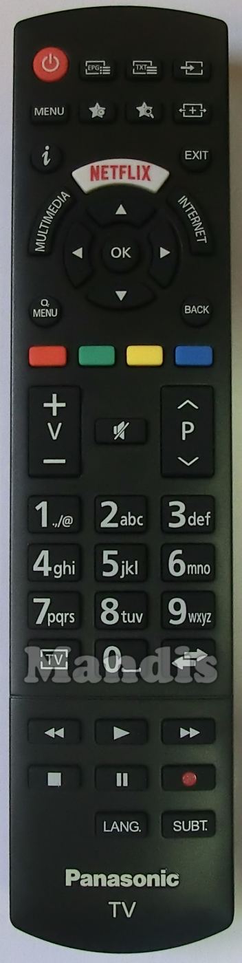 Power, [EPG≡], [TXT≡], Input, Menu, ◷, Search, ←[+]→, i, Exit, Netflix, Multimedia, Internet, Up, Down, Left, Right, OK, Menu, Back, Red, Green, Yellow, Blue, Vol+, Vol-, Mute, P+, P-, 1, 2, 3, 4, 5, 6, 7, 8, 9, 0, TV, Return, <<, Play, >>, Stop, Pause, Rec, LANG., SUBT.