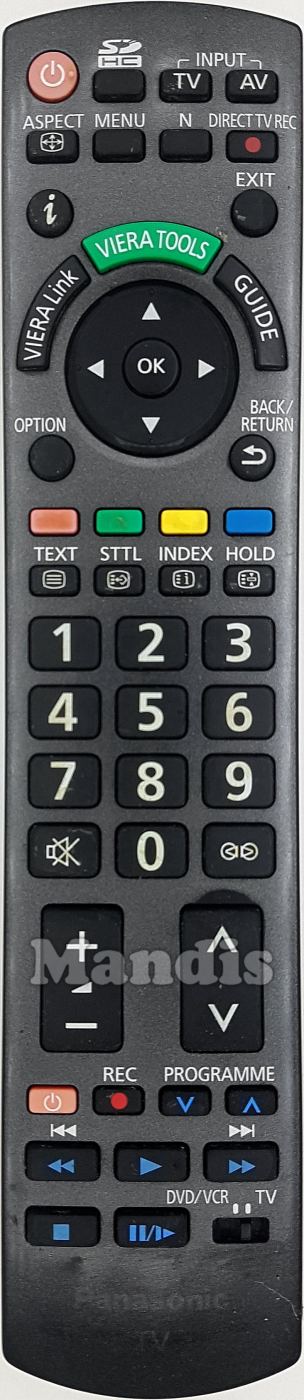 Power, SDHC, Input TV, Input AV, Aspect, Menu, N, Direct TV Rec, i, Exit, Viera Link, Viera Tools, Guide, Up, Left, OK, Right, Down, Option, Back / Return, Red, Green, Yellow, Blue, Text, STTL, Index, Hold, 1, 2, 3, 4, 5, 6, 7, 8, 9, 0, Mute, (<II>), Vol +, Vol -, CH +, CH -, Power (Lower), Rec, Programme + (lower), Programme - (lower), << / I<<, Play, >> / >>I, Stop, Pause / Step