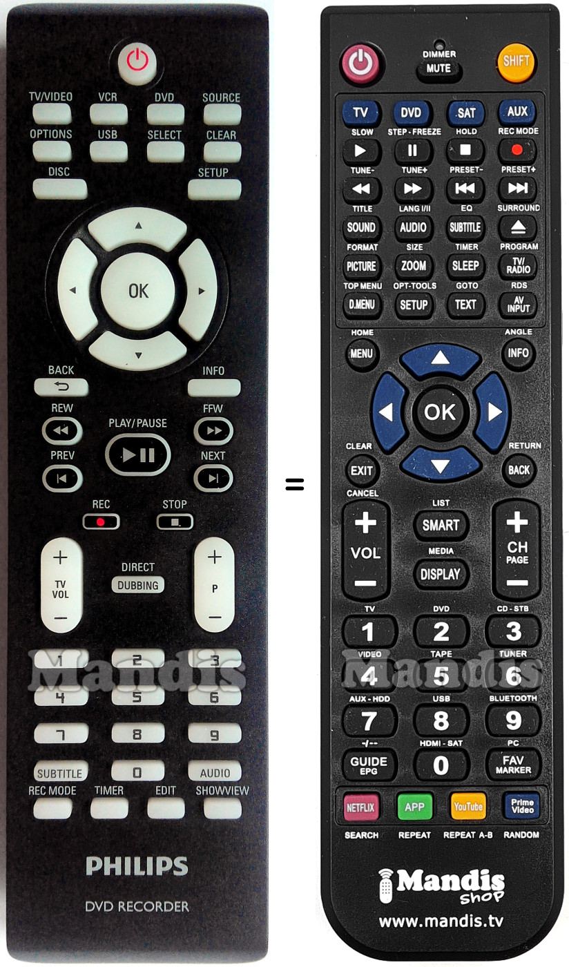 Below, we will show you the correspondence between each button on the original remote control and the button that performs the same function on the replacement remote control. In some cases, you may need to press the SHIFT key before pressing another button to perform certain actions. These additional functions are often not widely used and are included to facilitate understanding of the replacement remote control, or because the original remote control has more buttons than its equivalent.
