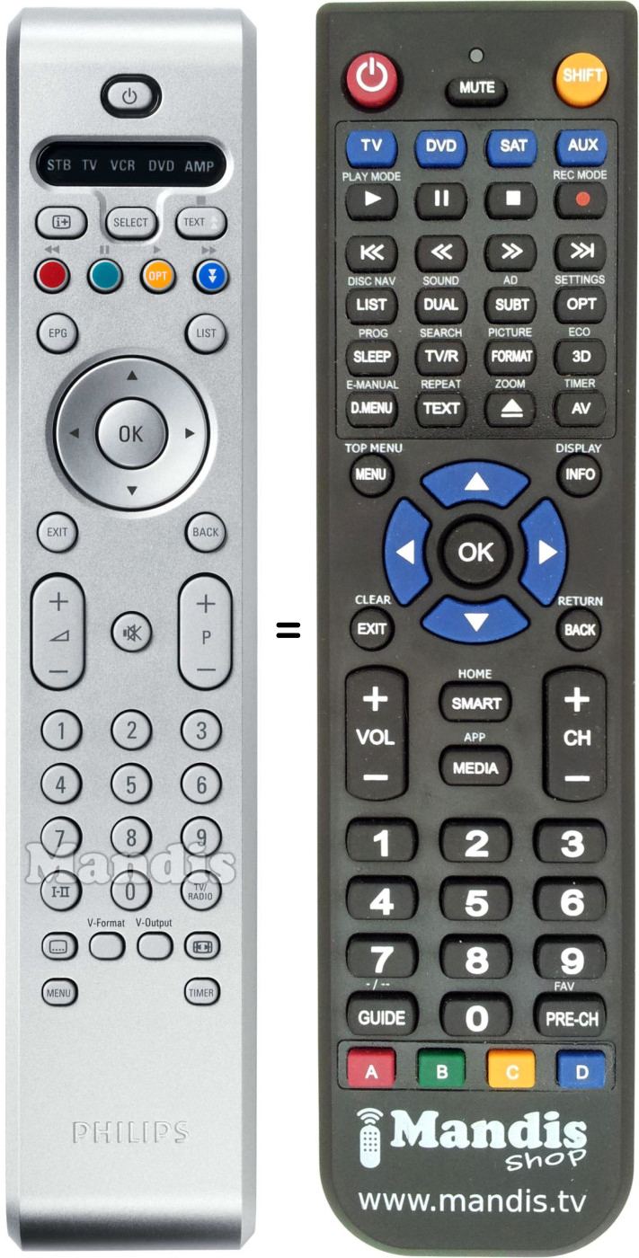 Below, we will show you the correspondence between each button on the original remote control and the button that performs the same function on the replacement remote control. In some cases, you may need to press the SHIFT key before pressing another button to perform certain actions. These additional functions are often not widely used and are included to facilitate understanding of the replacement remote control, or because the original remote control has more buttons than its equivalent.