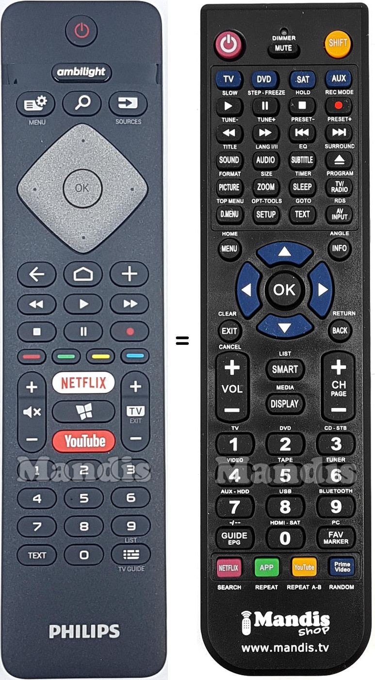 This remote control performs all the functions of the original remote control: Power, ambilight, Menu, Search, Sources, Up, Down, Right, Left, OK, ←, Home, +, <<, Play, >>, Stop, Pause, Rec, Red, Green, Yellow, Blue, Netflix, Windows, YouTube, Vol+, Vol-, CH+, CH-, Mute, Exit/Tv, 1, 2, 3, 4, 5, 6, 7, 8, 9, 0, Text, Tv Guide/List