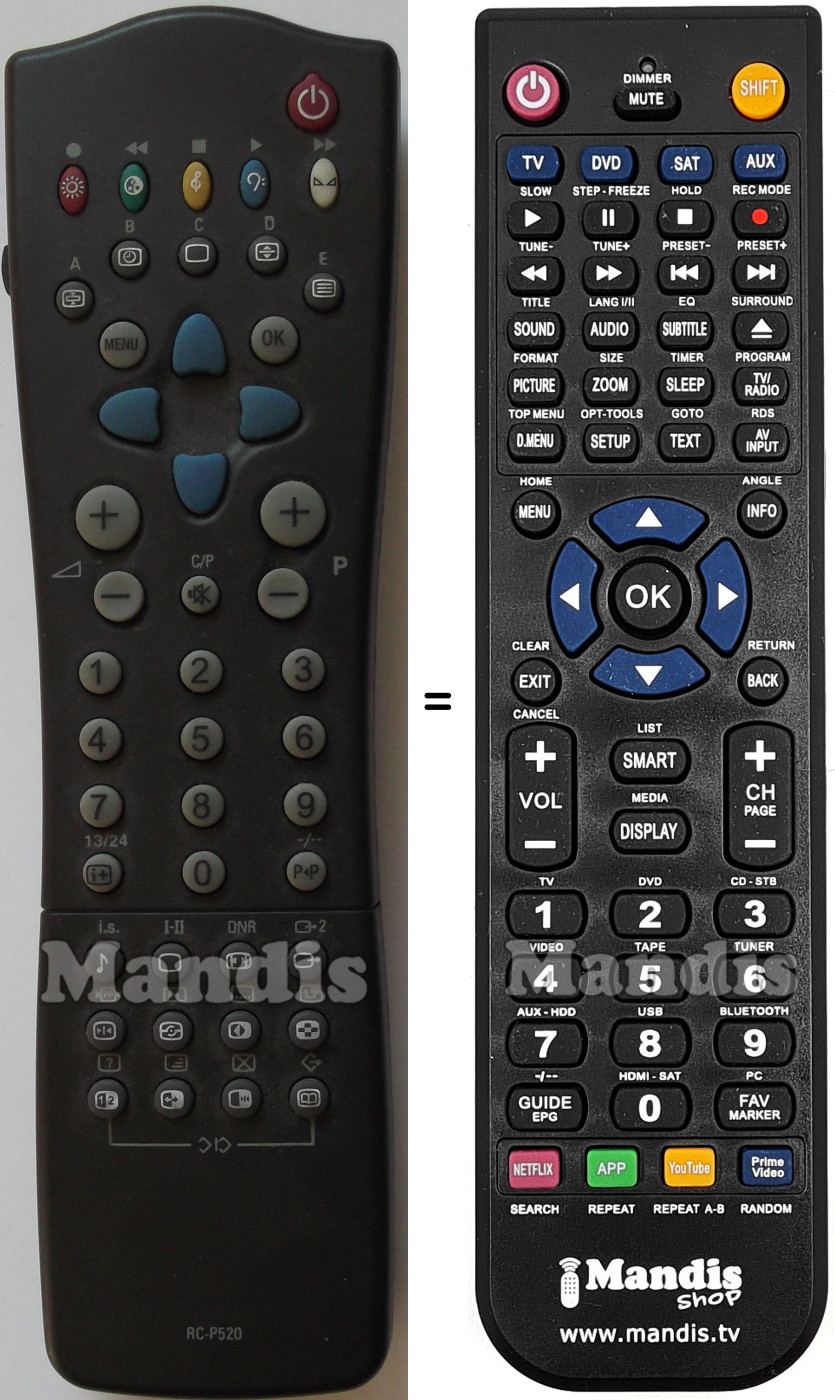 Below, we will show you the correspondence between each button on the original remote control and the button that performs the same function on the replacement remote control. In some cases, you may need to press the SHIFT key before pressing another button to perform certain actions. These additional functions are often not widely used and are included to facilitate understanding of the replacement remote control, or because the original remote control has more buttons than its equivalent.