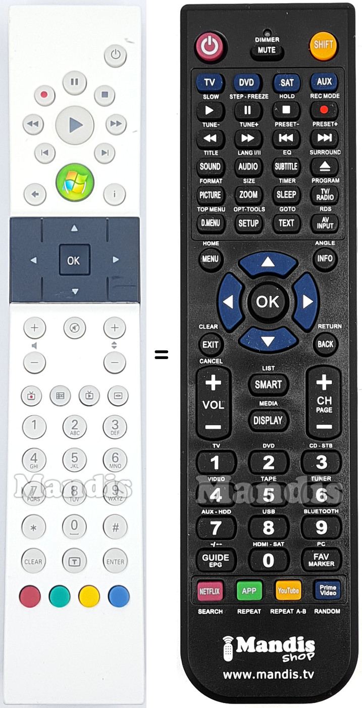Below, we will show you the correspondence between each button on the original remote control and the button that performs the same function on the replacement remote control. In some cases, you may need to press the SHIFT key before pressing another button to perform certain actions. These additional functions are often not widely used and are included to facilitate understanding of the replacement remote control, or because the original remote control has more buttons than its equivalent.