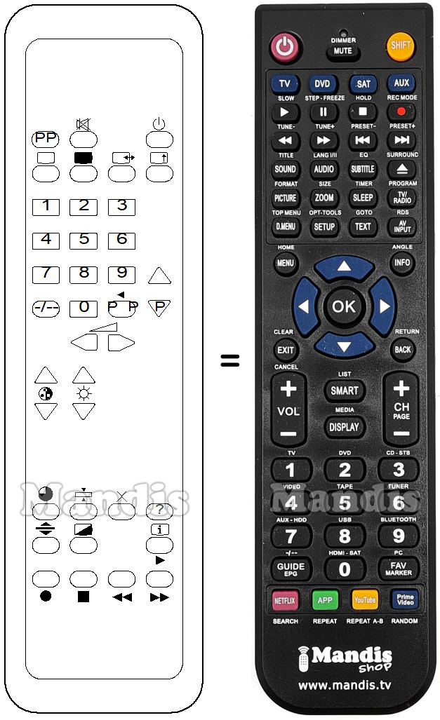 Below, we will show you the correspondence between each button on the original remote control and the button that performs the same function on the replacement remote control. In some cases, you may need to press the SHIFT key before pressing another button to perform certain actions. These additional functions are often not widely used and are included to facilitate understanding of the replacement remote control, or because the original remote control has more buttons than its equivalent.