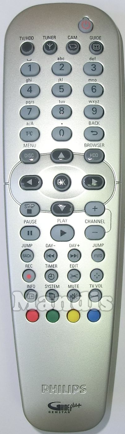 Power, TV / HDD, Tuner, Cam, Guide, 1, 2, 3, 4, 5, 6, 7, 8, 9, 0, T/C / a/A, Back, Disc / Menu, HDD / Browser, Up, Down, Right, Left, OK, Stop, Pause, Play, Channel +, Channel -, Back / Jump, I<< / Day -, >>I / Day +, FWD / Jump, Rec, Timer, Cut / Edit, TV Vol +, TV Vol -, Info, System, Mute, Red, Green, Yellow, Blue