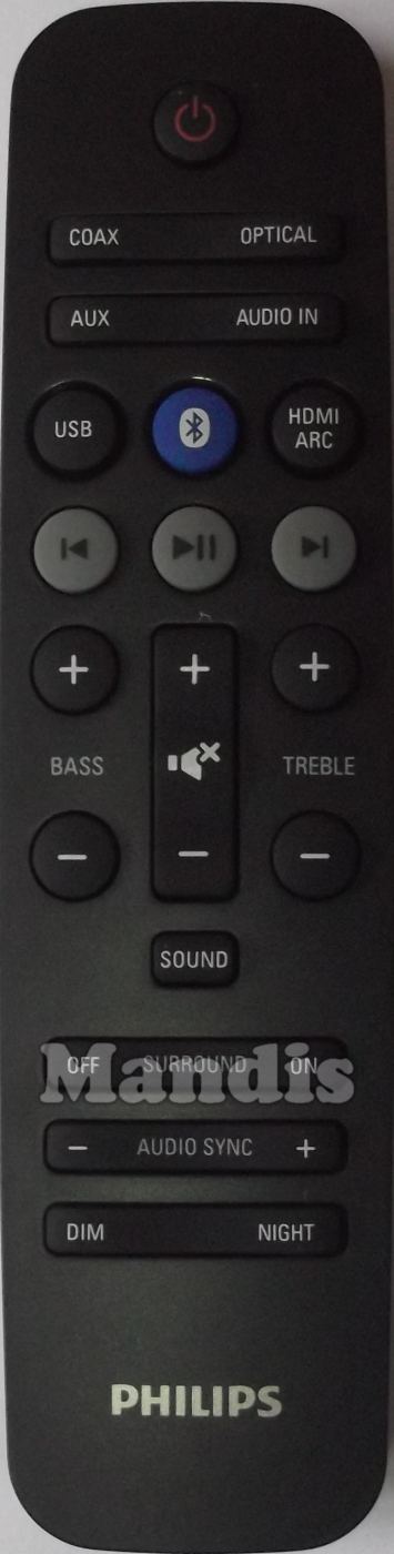Power, Coax, Optical, AUX, Audio In, USB, Bluetooth, HDMI ARC, Play/Pause, I<, >I, Bass+, Bass-, Treble+, Treble-, Vol+, Vol-, Mute, Sound, Surround Off, Surround On, Audio Sync -, Audio Sync +, DIM, Night