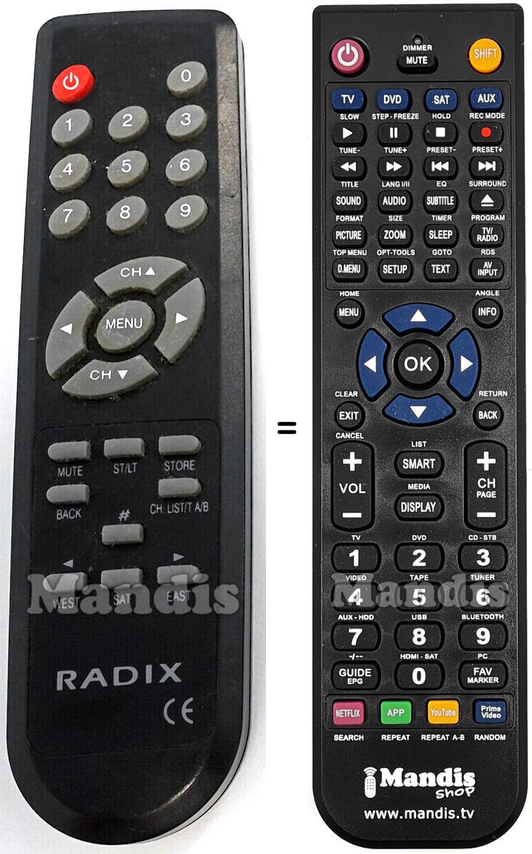 Below, we will show you the correspondence between each button on the original remote control and the button that performs the same function on the replacement remote control. In some cases, you may need to press the SHIFT key before pressing another button to perform certain actions. These additional functions are often not widely used and are included to facilitate understanding of the replacement remote control, or because the original remote control has more buttons than its equivalent.