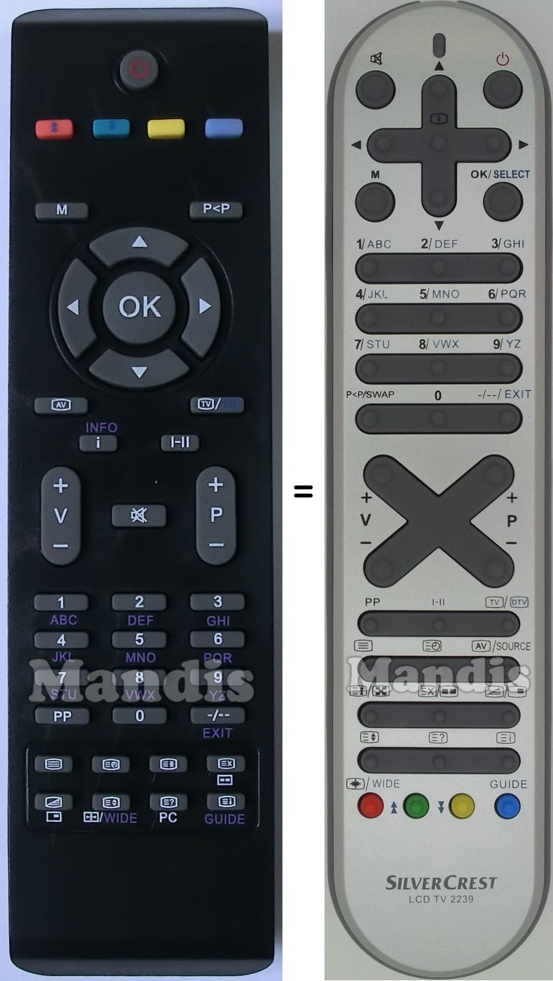 This remote control has the following buttons: Mute, Power, M, OK/Select, Up, Down, Right, Left, [i], 1, 2, 3, 4, 5, 6, 7, 8, 9, 0, P<P/Swap, -/--/ Exit, Vol+, Vol-, P+, P-, PP, I-II, Tv/DTV, [=], [=O], AV/Source, [=+]/[X], [=X]/[▪▪], [.=]/[ ▪], [=♦], [=?], [=i], Red/[+]/Wide/↑, Green/↓, Yellow, Blue/Guide
