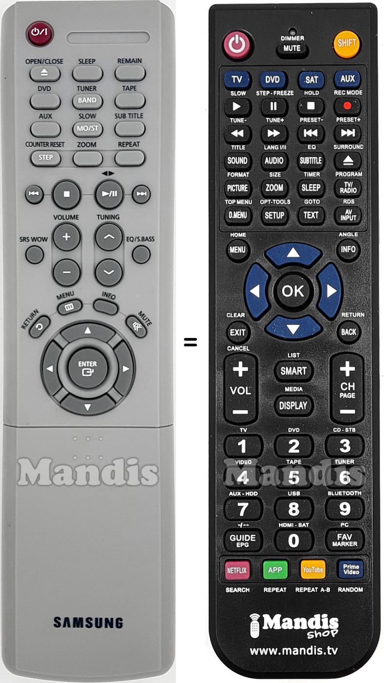 Below, we will show you the correspondence between each button on the original remote control and the button that performs the same function on the replacement remote control. In some cases, you may need to press the SHIFT key before pressing another button to perform certain actions. These additional functions are often not widely used and are included to facilitate understanding of the replacement remote control, or because the original remote control has more buttons than its equivalent.