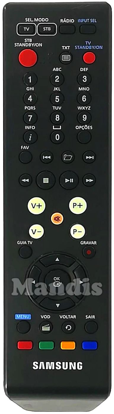 Sel. Modo TV, Sel. Modo STB, Rádio, Input Sel, STB Standby / On, TXT, TV Standby / On, 1, 2, 3, 4, 5, 6, 7, 8, 9, 0, Info, Opçoes, Fav, I<<, Folder, >>I, <<, Stop, Play / Pause, >>, V +, V -, Mute, P +, P -, Guia TV, Gravar, Up, Right, Down, Left, OK, Menu, VOD, Voltar, Sair, Red, Green, Yellow, Blue