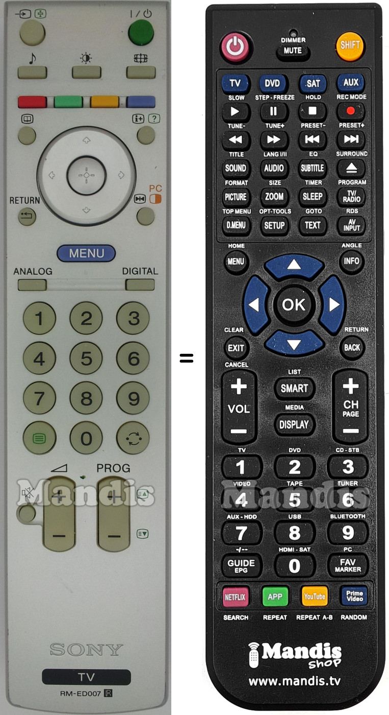 Below, we will show you the correspondence between each button on the original remote control and the button that performs the same function on the replacement remote control. In some cases, you may need to press the SHIFT key before pressing another button to perform certain actions. These additional functions are often not widely used and are included to facilitate understanding of the replacement remote control, or because the original remote control has more buttons than its equivalent.