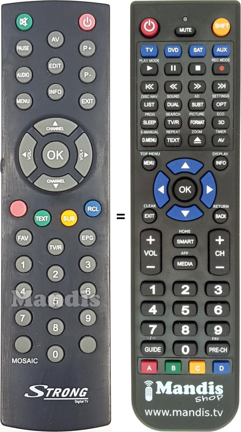 Below, we will show you the correspondence between each button on the original remote control and the button that performs the same function on the replacement remote control. In some cases, you may need to press the SHIFT key before pressing another button to perform certain actions. These additional functions are often not widely used and are included to facilitate understanding of the replacement remote control, or because the original remote control has more buttons than its equivalent.