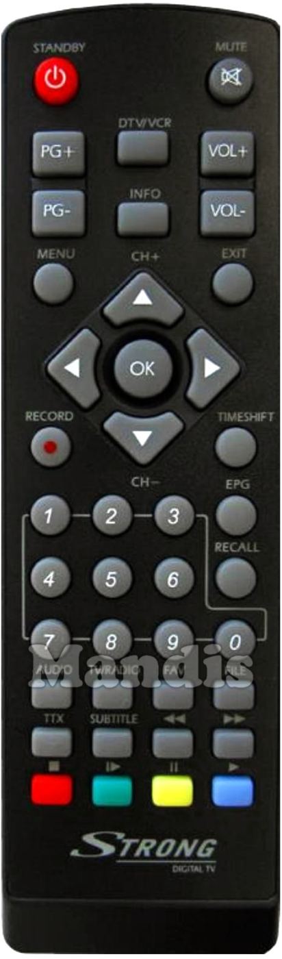 Standby, Mute, PG +, PG -, DTV / VCR, Info, Vol +, Vol -, Menu, Exit, Up / CH +, Down / CH -, Left, Right, OK, Record, Timeshift, EPG, Recall, 1, 2, 3, 4, 5, 6, 7, 8, 9, 0, Audio, TV / Radio, Fav, File, TTX, Subtitle, <<, >>, Red / Stop, Green / Step, Yellow / Pause, Blue / Play