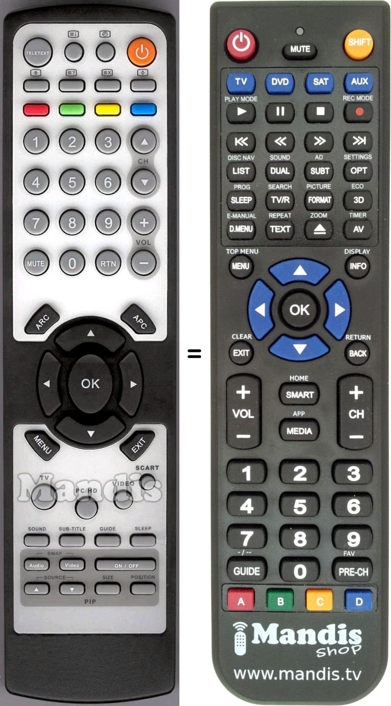 Below, we will show you the correspondence between each button on the original remote control and the button that performs the same function on the replacement remote control. In some cases, you may need to press the SHIFT key before pressing another button to perform certain actions. These additional functions are often not widely used and are included to facilitate understanding of the replacement remote control, or because the original remote control has more buttons than its equivalent.