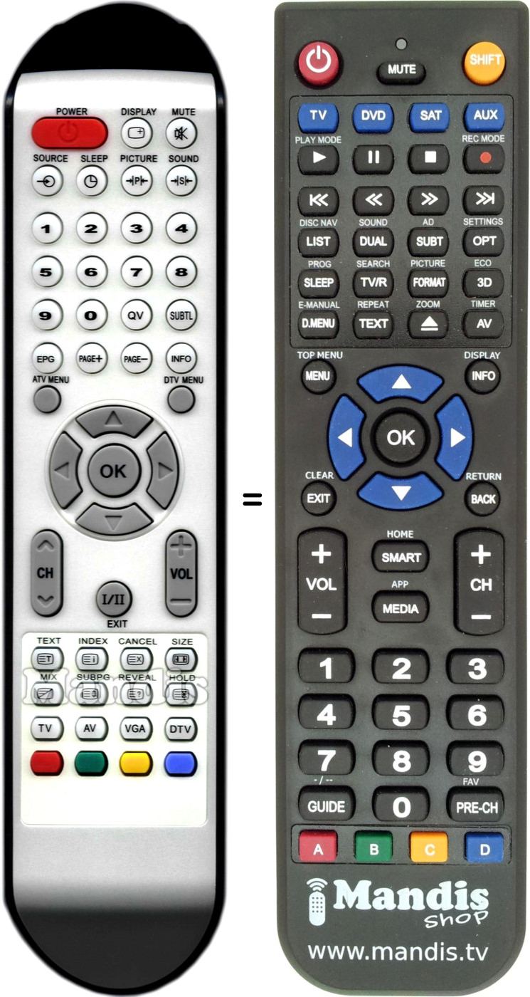 Below, we will show you the correspondence between each button on the original remote control and the button that performs the same function on the replacement remote control. In some cases, you may need to press the SHIFT key before pressing another button to perform certain actions. These additional functions are often not widely used and are included to facilitate understanding of the replacement remote control, or because the original remote control has more buttons than its equivalent.