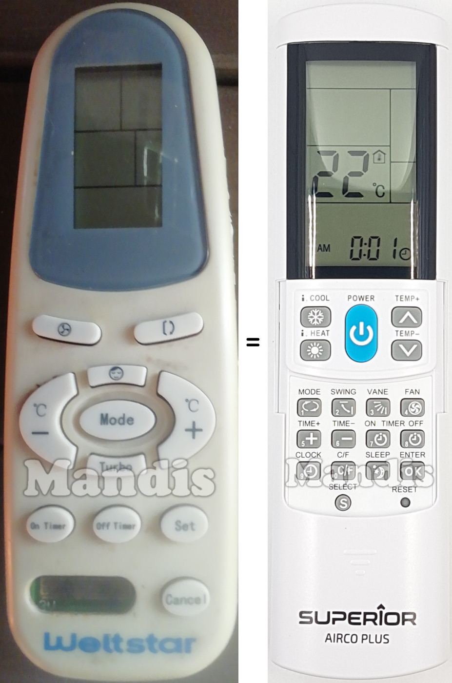My LG air-conditioner's remote died and need replacement. AircoPlus did the job. I should point out that the code match did not correspond according to manufacturer's table. Let the auto-search code set up do the work. Also, excellent service by Mandis Remotes with a well-protected package.