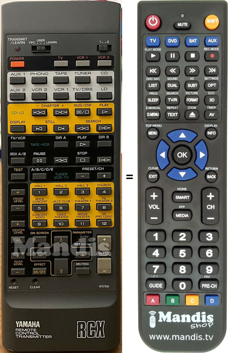Below, we will show you the correspondence between each button on the original remote control and the button that performs the same function on the replacement remote control. In some cases, you may need to press the SHIFT key before pressing another button to perform certain actions. These additional functions are often not widely used and are included to facilitate understanding of the replacement remote control, or because the original remote control has more buttons than its equivalent.
