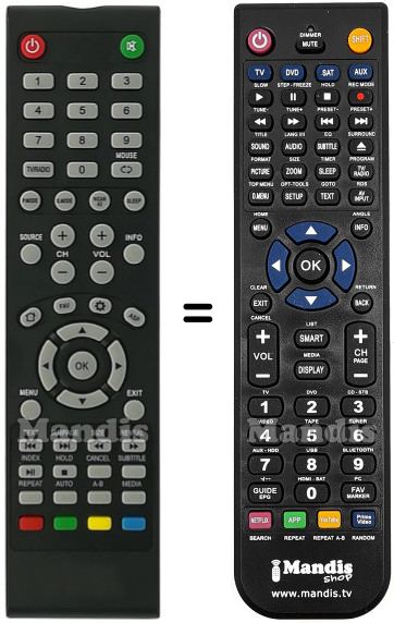 Below, we will show you the correspondence between each button on the original remote control and the button that performs the same function on the replacement remote control. In some cases, you may need to press the SHIFT key before pressing another button to perform certain actions. These additional functions are often not widely used and are included to facilitate understanding of the replacement remote control, or because the original remote control has more buttons than its equivalent.