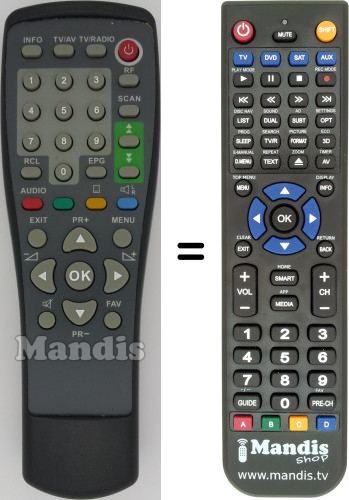 Below, we will show you the correspondence between each button on the original remote control and the button that performs the same function on the replacement remote control. In some cases, you may need to press the SHIFT key before pressing another button to perform certain actions. These additional functions are often not widely used and are included to facilitate understanding of the replacement remote control, or because the original remote control has more buttons than its equivalent.